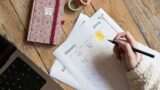 Wedding background with checklist and calendar. Female hands arranging marriage, filling in planners on white wooden table with lots of tender bridal stuff, top view